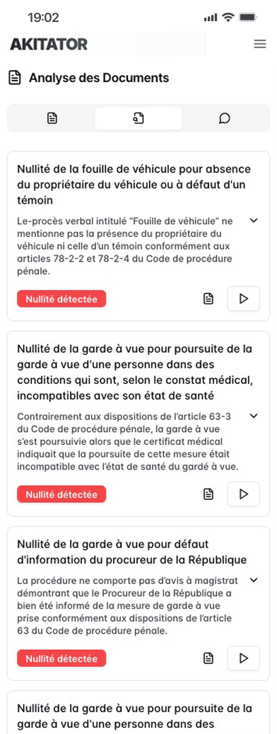 Notre IA s’appuie sur la jurisprudence actualisée et le Code de procédure pénale pour détecter chaque nullité. Chaque résultat est ainsi juridiquement fondé et argumenté.